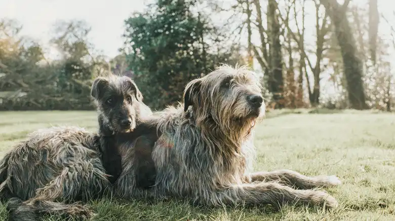Irish wolfhounds are much too big to be lap dogs, but they can provide a similar level of comfort. Their exercise needs are fairly moderate, and they don't mind spending plenty of time simply hanging out with family. Just beware of letting your chill wolfhound turn into a couch potato. They like being homebodies so much that they sometimes need encouragement to get up and exercise.