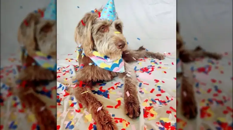 Piper's glowing in his birthday photos on TikTok. His pale blonde and tan coat blends wonderfully with the beige covering he's lying on. The birthday hat, bandana, and colorful confetti add bright pops of visual interest. It's a professional-quality shot that showcases Piper's weimardoodle beauty. Weimardoodles have poodles and Weimaraners for parents. The breeding lottery can throw up any trait that exists between the breeds. Yet, many Weimardoodles inherit the Weimaraner's insatiable energy and mischievous habits. Piper's owner chose @hyper.piper27 for his TikTok handle, a nod to Piper's active ways.