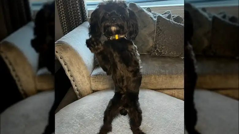 Some dogs expect treats for nothing. Ollie's willing to dance for his goodies! This picture, posted on TikTok, reveals his happy dance. Like all party animals, he's up on his feet and waving his arms like he just doesn't care. Ollie's a typical chipoo. His non-poodle parent is a Chihuahua. Interestingly, this mix brings together the national dogs of two countries. The chihuahua represents Mexico, while the poodle is the canine symbol of France.