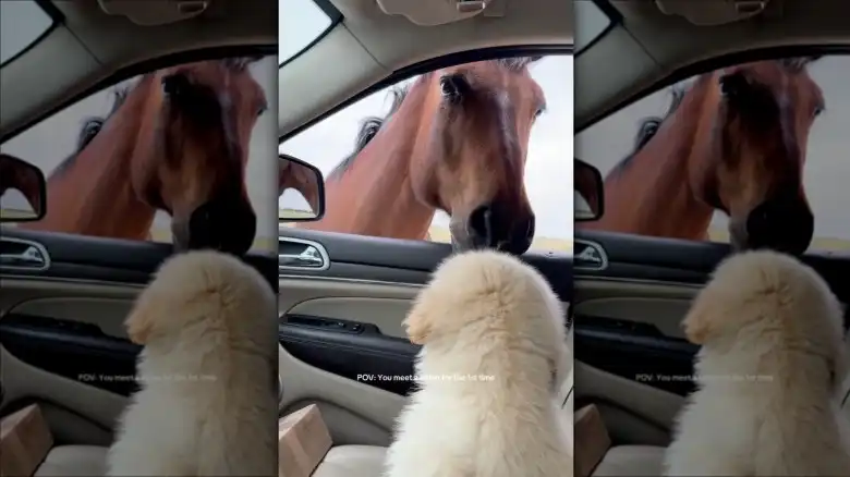 ByCynthia AnayaUpdated: Sept. 26, 2025 3:05 pm ESTMost dogs are used to seeing animals somewhat close to their own size, like cats, rabbits, squirrels, and other dogs, in passing, from a distance, or through a window. Seeing a significantly larger animal, like a horse, isn't something dogs typically experience. However, one pet parent — also a horse owner — decided to film the precious moment her fluffy golden retriever puppy, Walter, met her horse, Lottie, through an open car window. She shared the adorable video on TikTok.