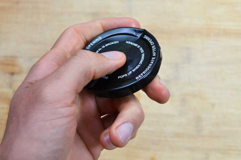 Tap the blade of the screwdriver with the rubber mallet, causing the handle end to force a depression in the top of the lid. Even with a lid that has a safety-seal button that you can depress, you'll want to indent the center of the lid a bit more to make a decisive click when you press it from the underside.