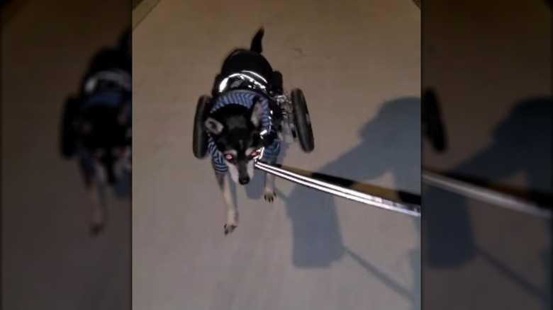 The cheeky text visible at the start of the clip says Hamish is coming home after a night at the pub. The joke's writer may have been inspired by Hamish's crooked course over the sidewalk. The camera captured him following the leash but occasionally veering slightly left or right. Like most of the dogs on this list, Hamish is quite adept with his wheelchair. The minor directional changes seem to have been influenced by conditions of the sidewalk rather than problems with the wheels.