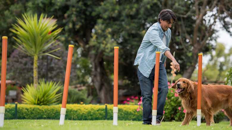 You can buy agility equipment online at Chewy, Amazon, and other online retailers, or you can make your own. Common equipment includes open tunnels, bar jumps, tire jumps, and weave poles. Your dog will need to have basic obedience skills before it can get started. When it's mastered the basics, grab your running shoes; as the handler, you'll need to run with your dog to train it to go through the obstacles.
