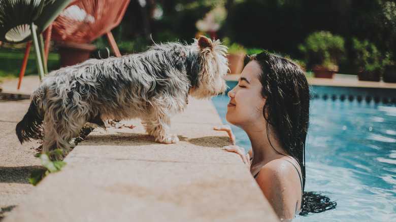 Of course, your dog's swimming activities won't mirror yours — although it'd be pretty neat to see a dog doing the backstroke — but your pup will still get plenty of stimulation and exercise, and have fun doing it. To give your dog an added challenge, gather up some pool-friendly toys (ones that will float) and throw one in the pool while your dog is on land and see if it will jump in after it.