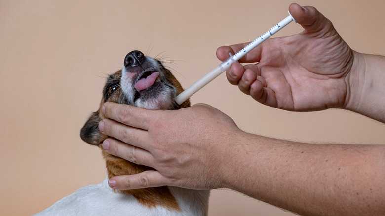 In order to successfully administer a syringe, Dr. Malcolm Weir and Dr. Ernest Ward suggest putting the tip of the syringe in your pup's mouth right behind their canine teeth, angling it to deposit the medicine on their tongue, and squeezing the syringe slowly to make sure they have time to swallow the liquid, per VCA Animal Hospitals. Dr. Barrett calls this corner of their mouth the "pocket." "Liquid medication should ideally hit the back of your dog's tongue towards the throat to be swallowed properly," she says. "It allows your dog to swallow naturally and minimizes the chances of them spitting out the medication."